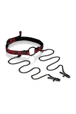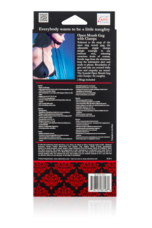 Кляп-рамка Scandal Open Mouth Gag with Clamps с зажимами на соски - изысканная жесткость. Регулируемая пряжка - дизайнерская ткань с чувственной росписью на внешней стороне, мягкая и плюшевая внутри. Регулируемые зажимы на цепях с резиновыми прокладками для удовольствия сосков. Эстетика и красота в каждой детали. Комфорт и безопасность во время игры. Размер: каждый зажим: длина - 5,75 см, диаметр - 3,25 см; каждая цень: длина 56 см; 3,75 см диаметр кольца; пряжка регулируется до 59 см. Материал: Полиэстер, Никель, Резина, ПВХ. Цвет: Красный, чёрный. Производитель: California Exotic Novelties, США.